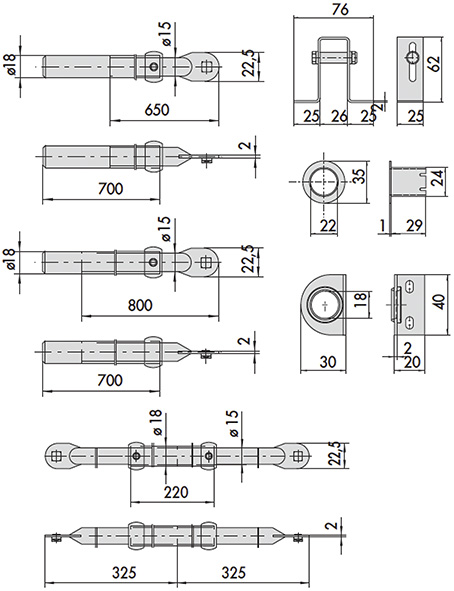 Kit aste catenaccio per serrature a 5 punti di chiusura. In dotazione: 2 coppia aste alto basso, 1 asta trasversale, 2 bocchette superiori, 2 bocchette a pavimento, 4 occhielli guida aste. Per serrature art.56172, 56177, 57172, 57177.