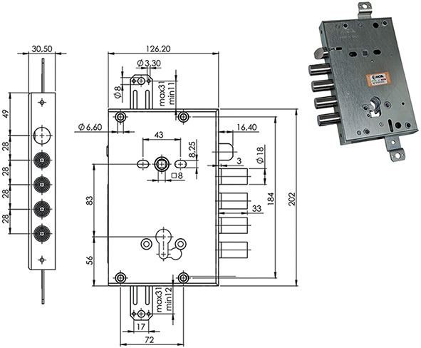 Serratura reversibile triplice AD INGRANAGGI per porte blindate. 2 mandate e scrocco reversibile. Per cilindro europeo. Con trappola antieffrazione. Cilindro, mostrine e aste non compresi. Serie CI. Defender interasse mm.38 viti M6. COMPATIBILE CISA.