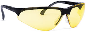 Design sportivo. Montatura nera. Stanghette regolabili in lunghezza. Morbidi appoggi sul naso adattabili. Lente ambra antigraffio in policarbonato. Protezione UV 100%. CE certificati DPI EN166-EN170.