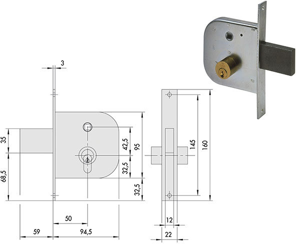 Serrature per cancelli. Scrocco con catenaccio incorporato. 1 mandata. Quadro maniglia passante. Frontale in acciaio zincato mm.22x160. In dotazione coppia cilindri tondi (art.02156.00 ns.cod.837587) con 3 chiavi (grezzo ricambio ns.cod.880354).