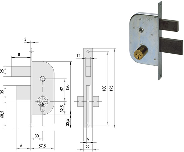 Serrature per cancelli. 2 mandate. Catenaccio e scrocco azionato dalla maniglia. Quadro maniglia passante. Frontale in acciaio zincato mm.22x160. In dotazione coppia cilindri tondi (art.02156.00 ns.cod.837587) con 3 chiavi (grezzo ricambio ns.cod.880354).