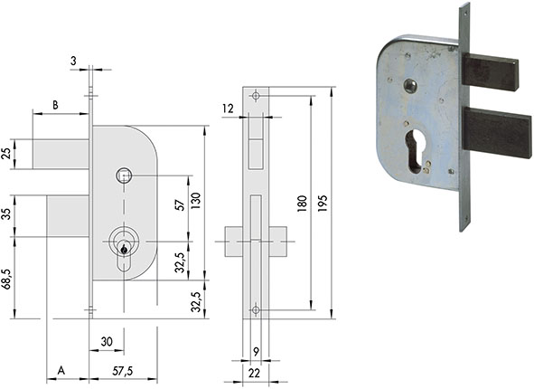 Serrature per cancelli. 2 mandate. Catenaccio e scrocco azionato dalla maniglia. Quadro maniglia passante. Frontale in acciaio zincato mm.22x160. Predisposte per cilindro profilo europeo.