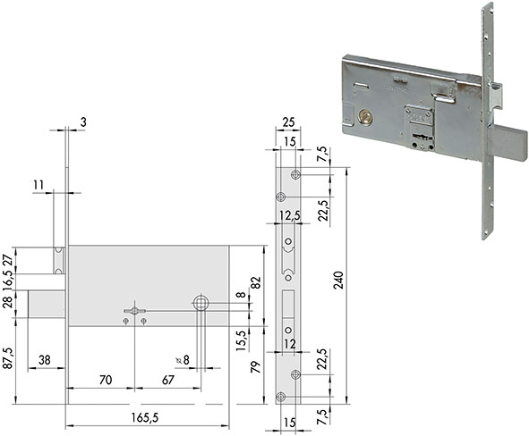 Serrature a doppia mappa per fasce. 4 mandate. Catenaccio e scrocco. Scatola altezza mm.82. Frontale zincato. Quadro maniglia mm.8. Con 3 chiavi art.00100.00.1 ns.cod.837905 (chiave grezza ricambio ns.cod.853580).