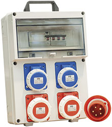 Scocca in materiale termoplastico. Cavo mt.2 con 1 spina rossa 4P+T 16A 230V. Prese 2 blu 2P+T 16A 230V e 2 rosse 3P+T 16A 400V. Interruttore differenziale-magnetotermico 16A.