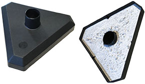 Base triangolare in PVC nero, riempita di cemento come zavorra. Lato cm.29. Peso kg.2,9.