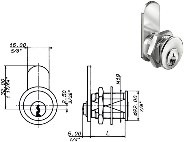 Serratura universale per mobili. Cilindro a spine d.mm.19. Rotazione 90?dx + 90?sx (1 uscita chiave). Due chiavi in dotazione. (Chiave ricambio ns.cod.880574). Attacco levetta Q.mm.7. Al bisogno abbinabile a levette ns.cod.844158-70-71-72-75-76-86.