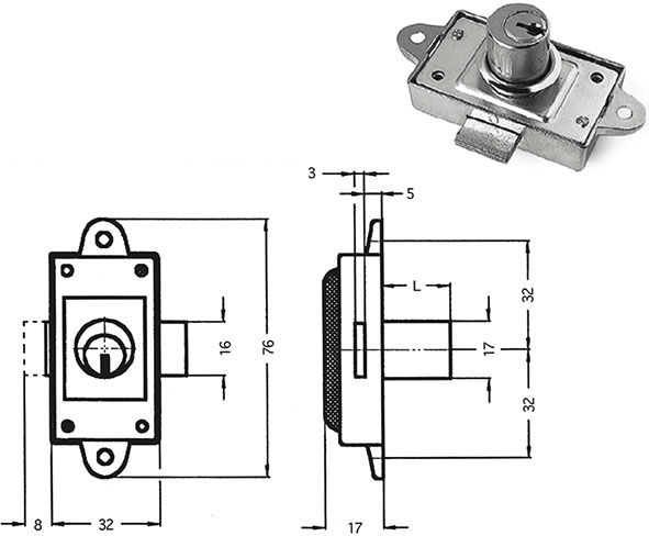 Serratura Meroni-CAS per antine da applicare ad aste rotanti. Cilindro a spine d.mm.17. Scatola in zama. Rotazione 360? (2 uscite chiave). 2 chiavi in dotazione. (Chiave ricambio ns.cod.880344). Senza aste ns.cod.849354/55. Senza accessori ns.cod.849359/61.